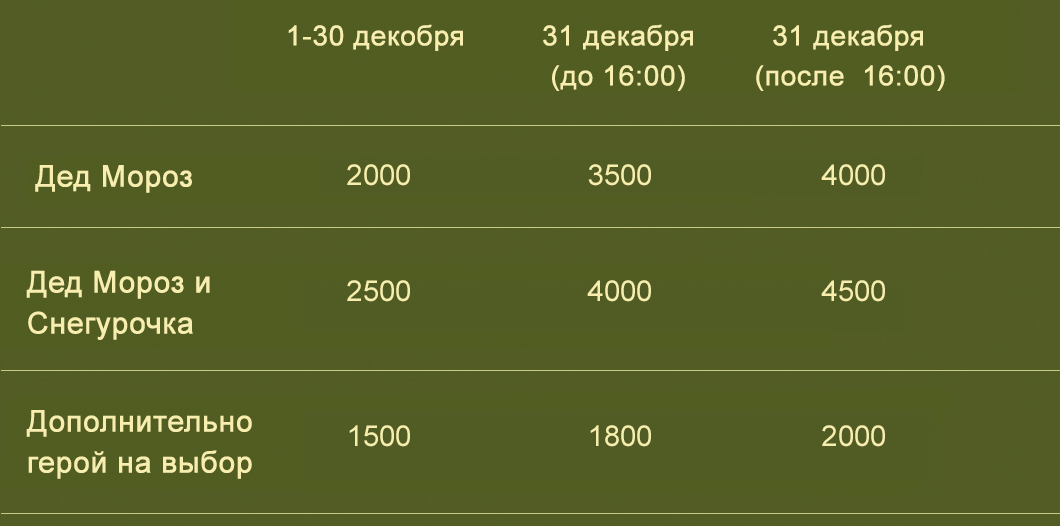 Дед Мороз;2200;3800;4300 Дед Мороз и Снегурочка;2800;4500;5000 Дополнительно герой на выбор;2000;2500;3000